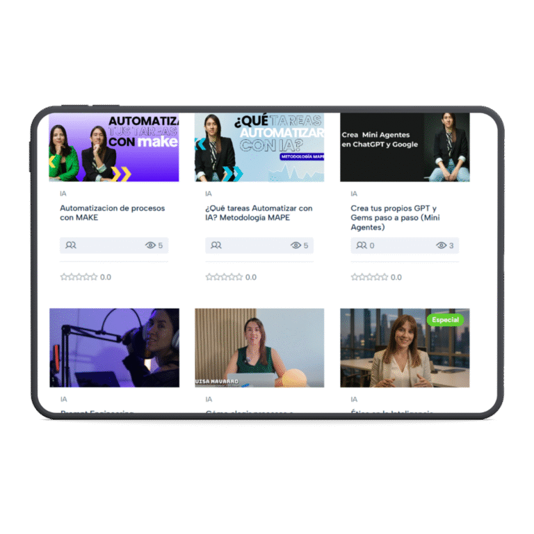 Materiales pregrabados, guías, prompts, plantillas y GPTs personalizados. Todo lo que necesitan para seguir aplicando IA después del curso.